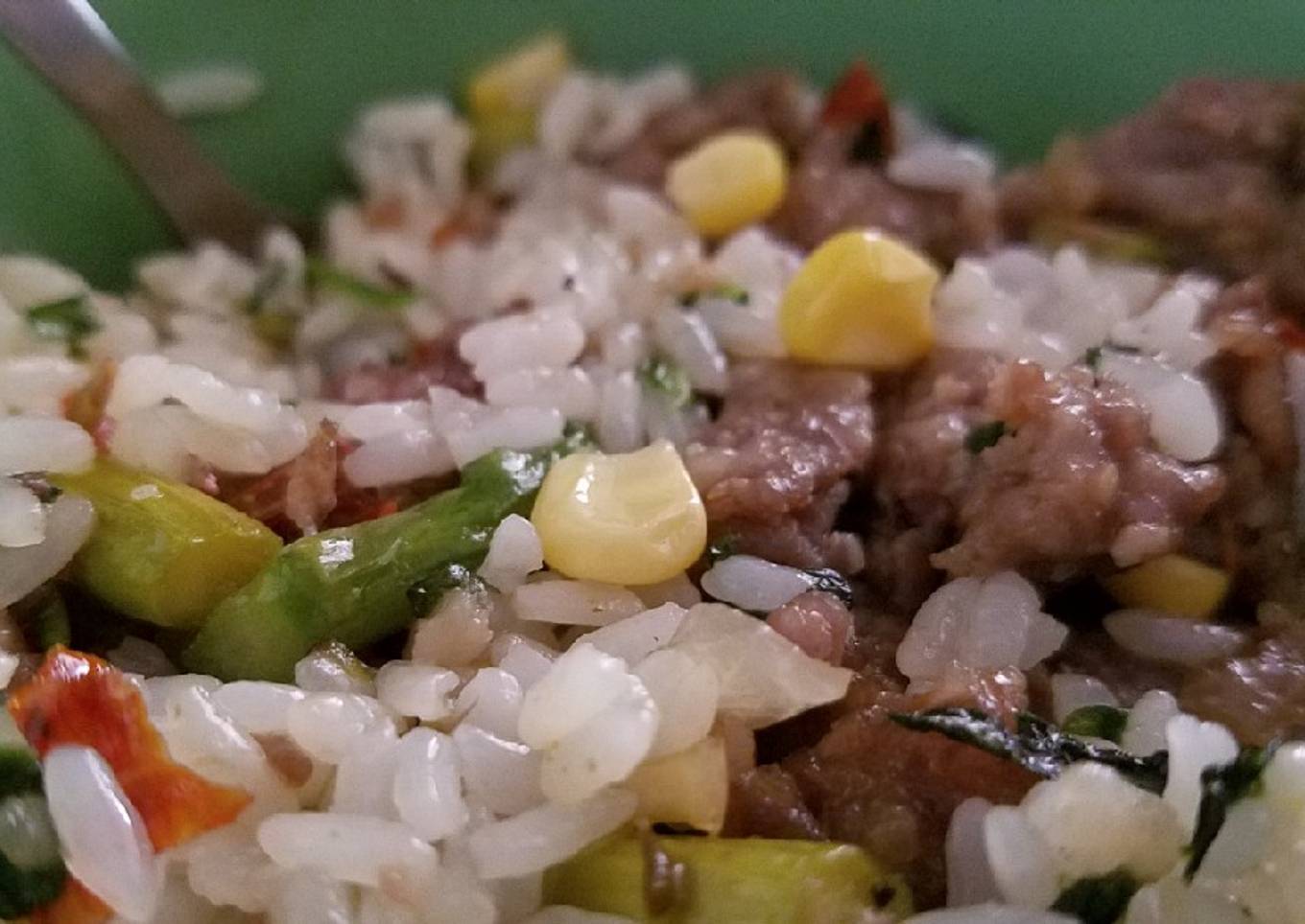 - In a pan over medium high heat, add your onions. When they start to turn brownish add your sausage (and a little oil), turning down the heat to medium. Dice up the sausage as it cooks, then add your hot peppers, sweet corn, and asparagus. Cover pan, let cook until sausage is thoroughly cooked. About 8-10 minutes. Add spinach, and turn off the heat.