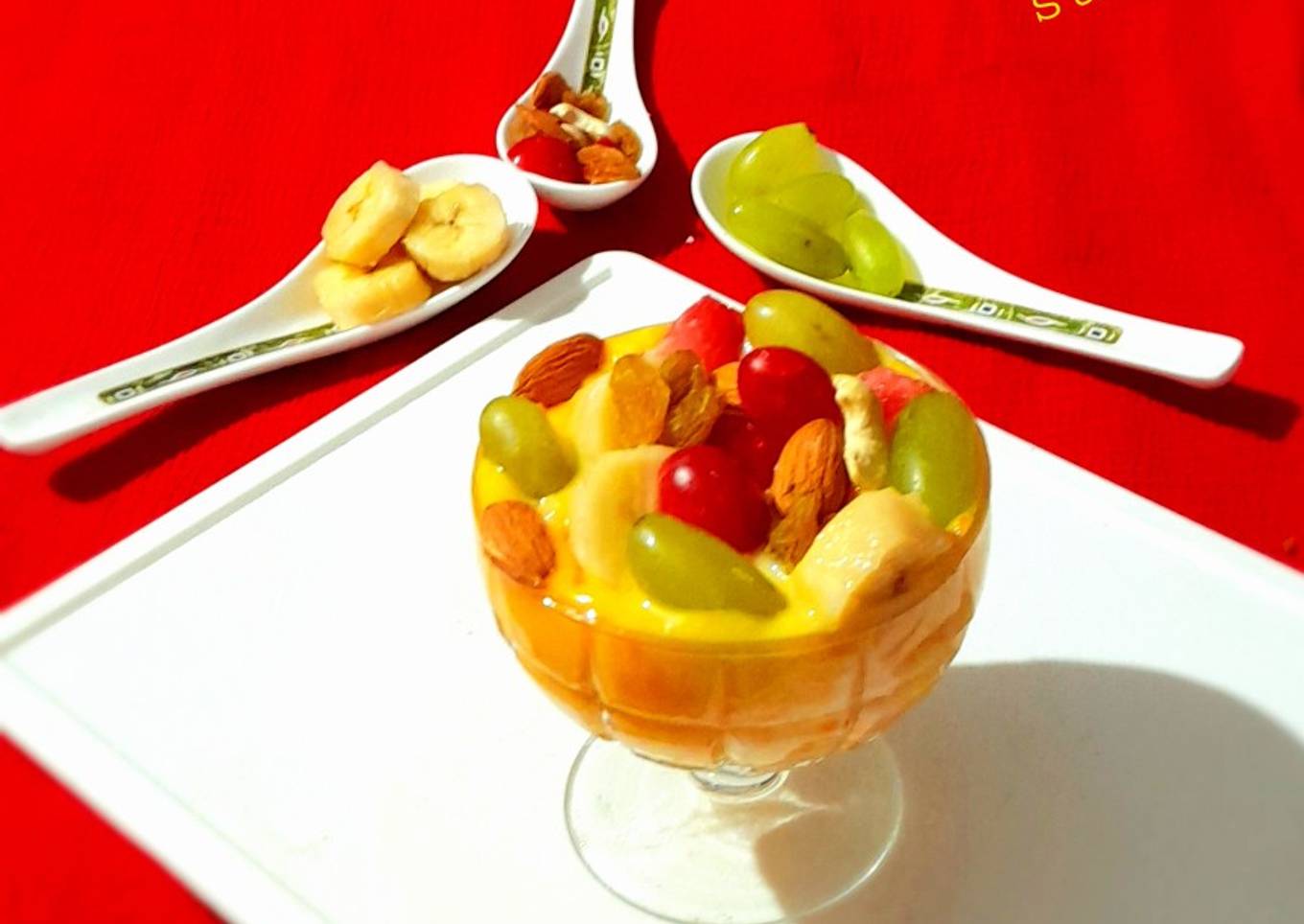 A simple and easy dessert, made from custard powder, milk, fruits, seviyan and sugar. Let's make some colourful dessert.