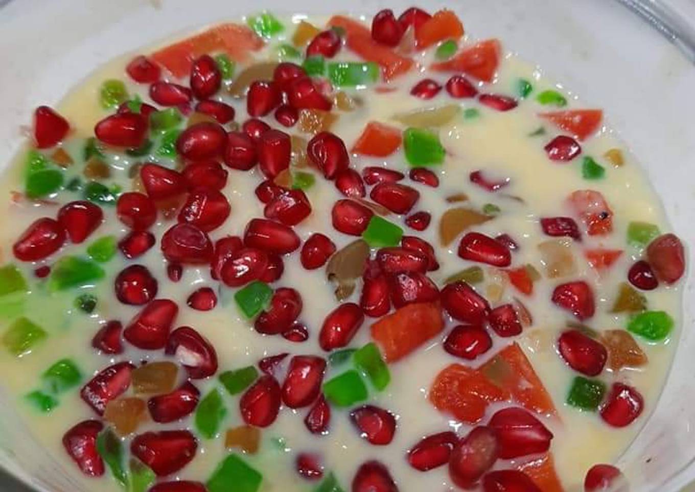 - Add mango, grapes, papaya, pomegranate, almonds, raisin in custard and mix well. Refrigerate for one hour. Garnishing with some tutti fruiti. Fruit custard is ready to serve.