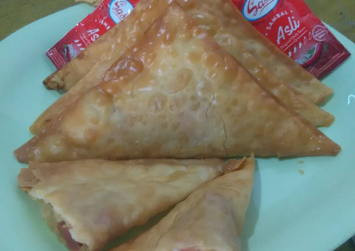 - Take one sheet wonton wrapper, fill with one table spoon filling, glue with water at side, folding into triangle shape. Ready to fried.